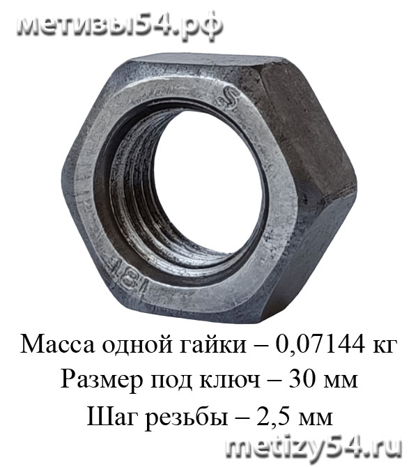 Вес одной гайки М20 ГОСТ 5915-70, ГОСТ 5927-70, ГОСТ Р ИСО 4032-2014, DIN 934 равен 0,07144 кг.
